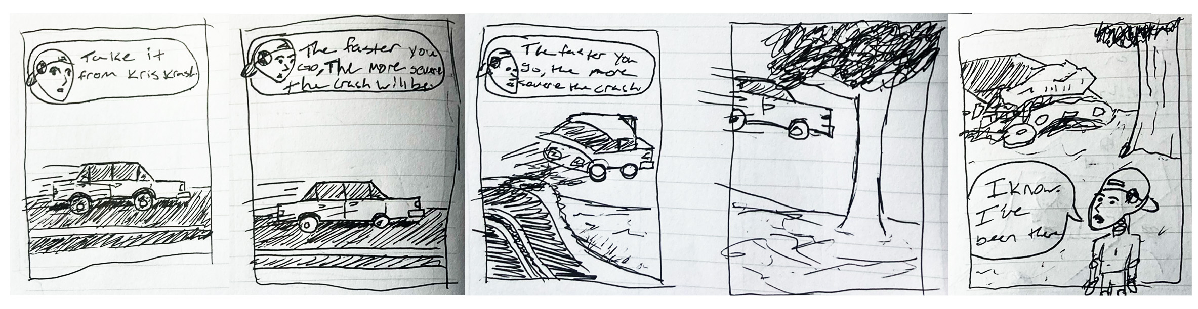 Once an idea is landed on I begin with sketches and storyboarding with the end goal being a storyboard that outlines every second of the video. Then we send the finished storyboard out for approval from DOHS (Delaware Office of Highway Safety).